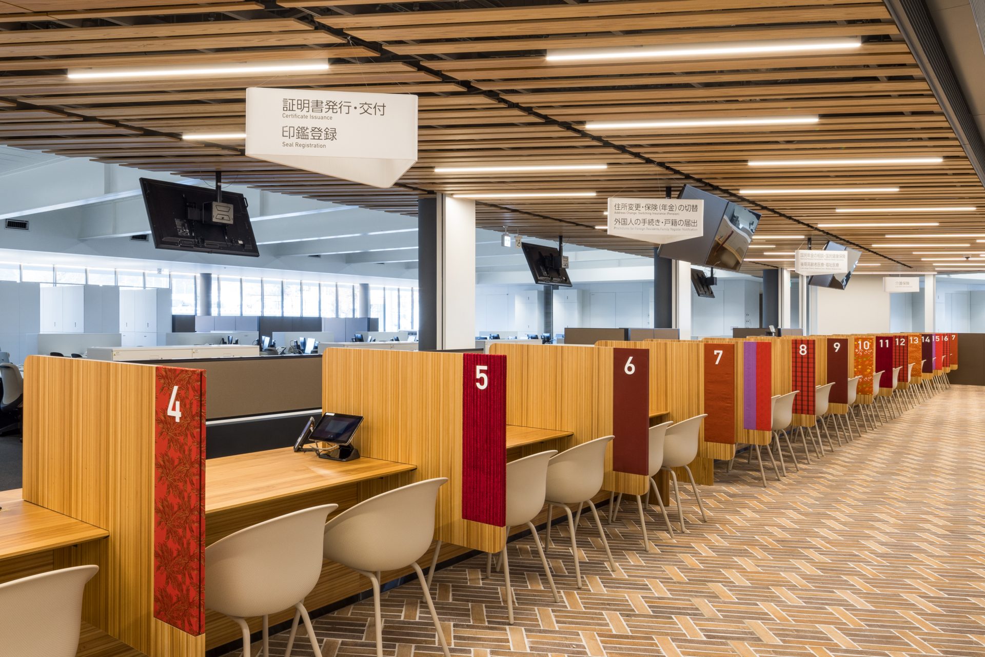 外部の軒や内装には桐生市産の杉材が使用され、家具やサインなど各所にあしらわれた桐生織を巡ることで桐生の織物産業の多様性を感じることができます。