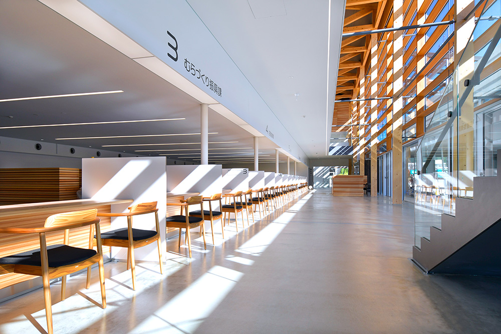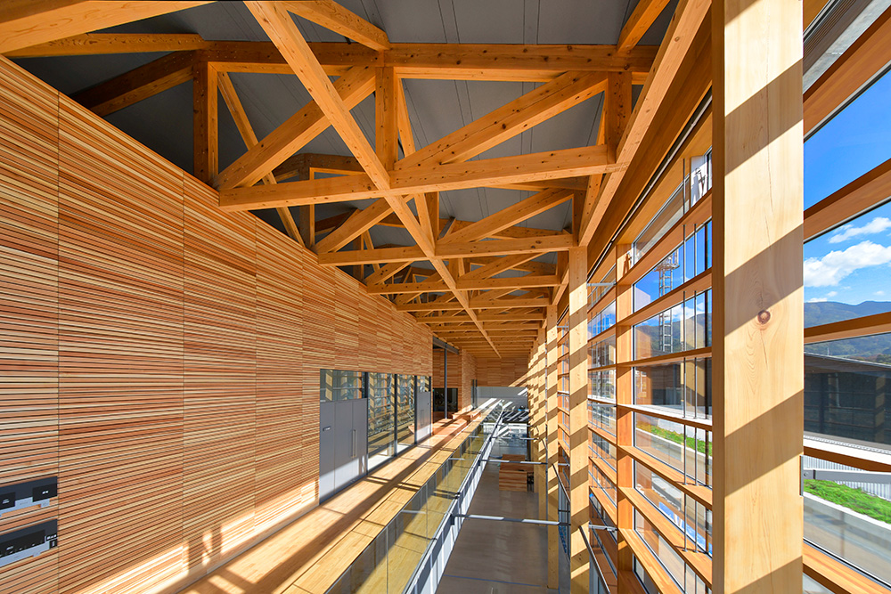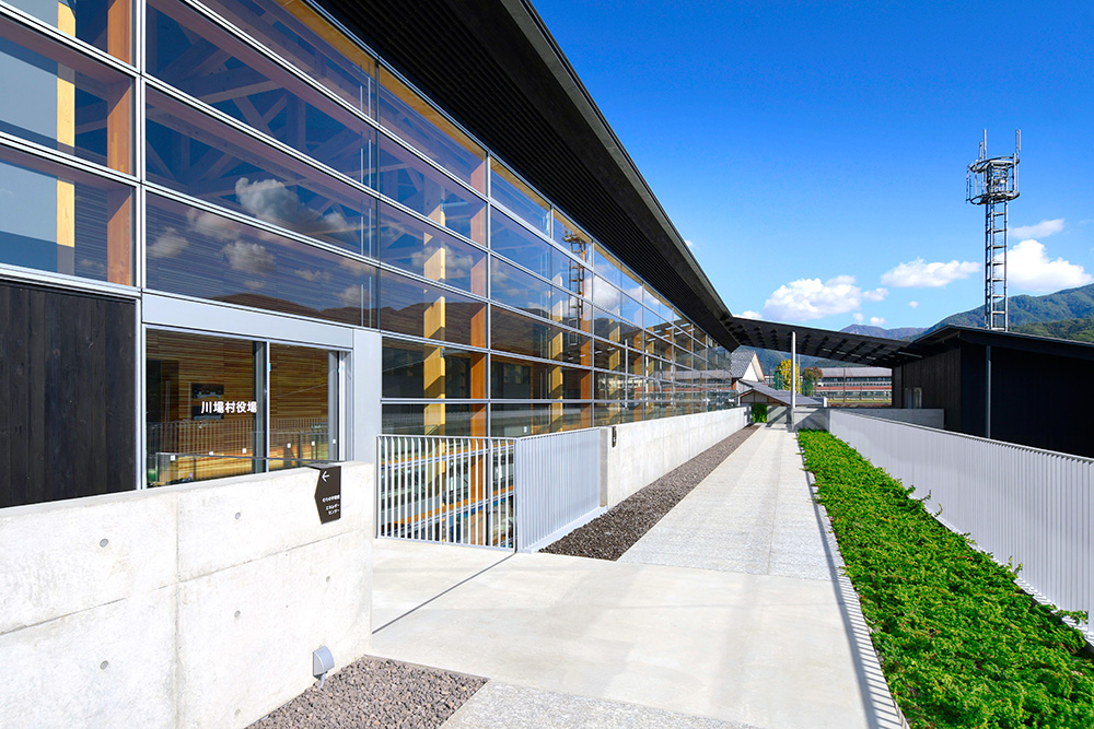 メインとなる役場庁舎は、正面はガラス張りの吹き抜けで、外壁や構造材、内装には川場産の木材を使用しています。エネルギーセンターには木チップを燃料とするバイオマスボイラーや、施設屋根の太陽光発電の蓄電池などがあり、施設全体のエネルギー供給機能を担っています。敷地内の各施設は連絡ブリッジで結ばれ、地上と2階部分で行き来ができるようになっています。