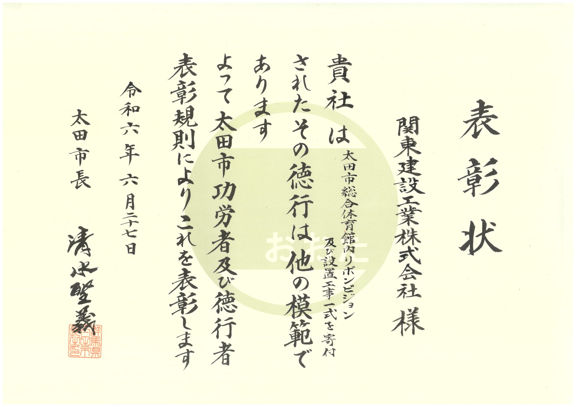 当社は6月27日に行われた令和6年度太田市功労者及び徳行舎表彰式において、昨年4月に竣工した太田市総合体育館(オープンハウスアリーナ太田)にリボンビジョンを寄付したことにより、徳行者として表彰されました。また、永年県土整備の推進に貢献し、群馬県総合表彰を受賞したことにより、功労者としても表彰されました。