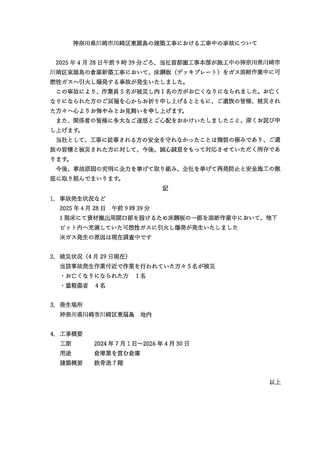 神奈川県川崎市川崎区東扇島の建設工事における工事中の事故について