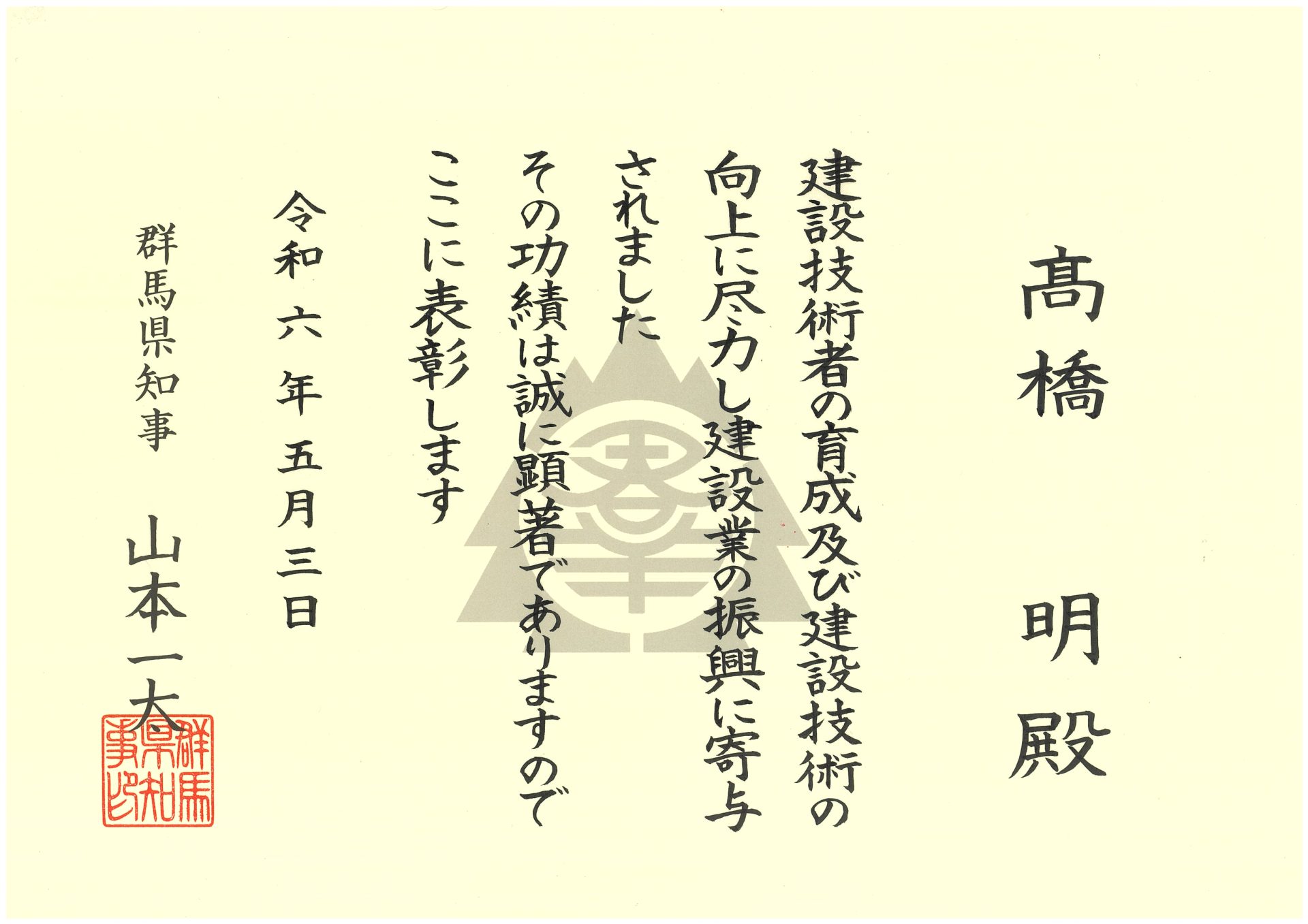 当社社長の髙橋明は、群馬県建設業協会副会長を務めるなど、建設業の振興への寄与が認められ、県土整備部門で表彰を受けました。