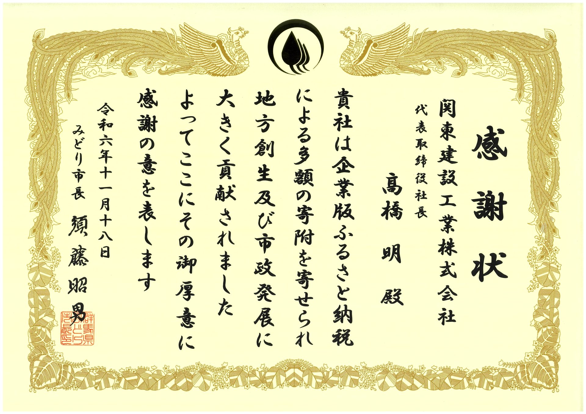 また同日11月18日には、みどり市より企業版ふるさと納税による寄付に対する感謝状を頂戴しました。